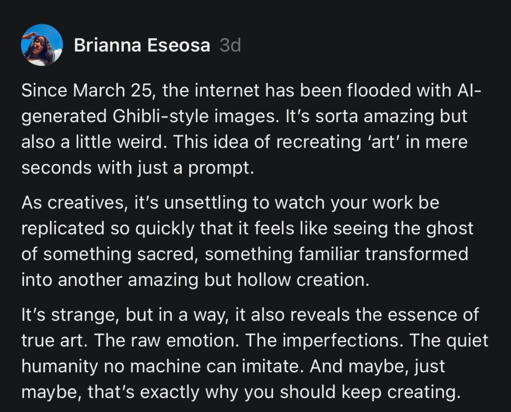 But it makes me wonder – if AI is already doing this for copywriting, what happens when it starts mimicking the deeper, more intuitive side of creativity? The kind that pulls from lived experiences, emotions, and stories? The kind that makes art, well… art?